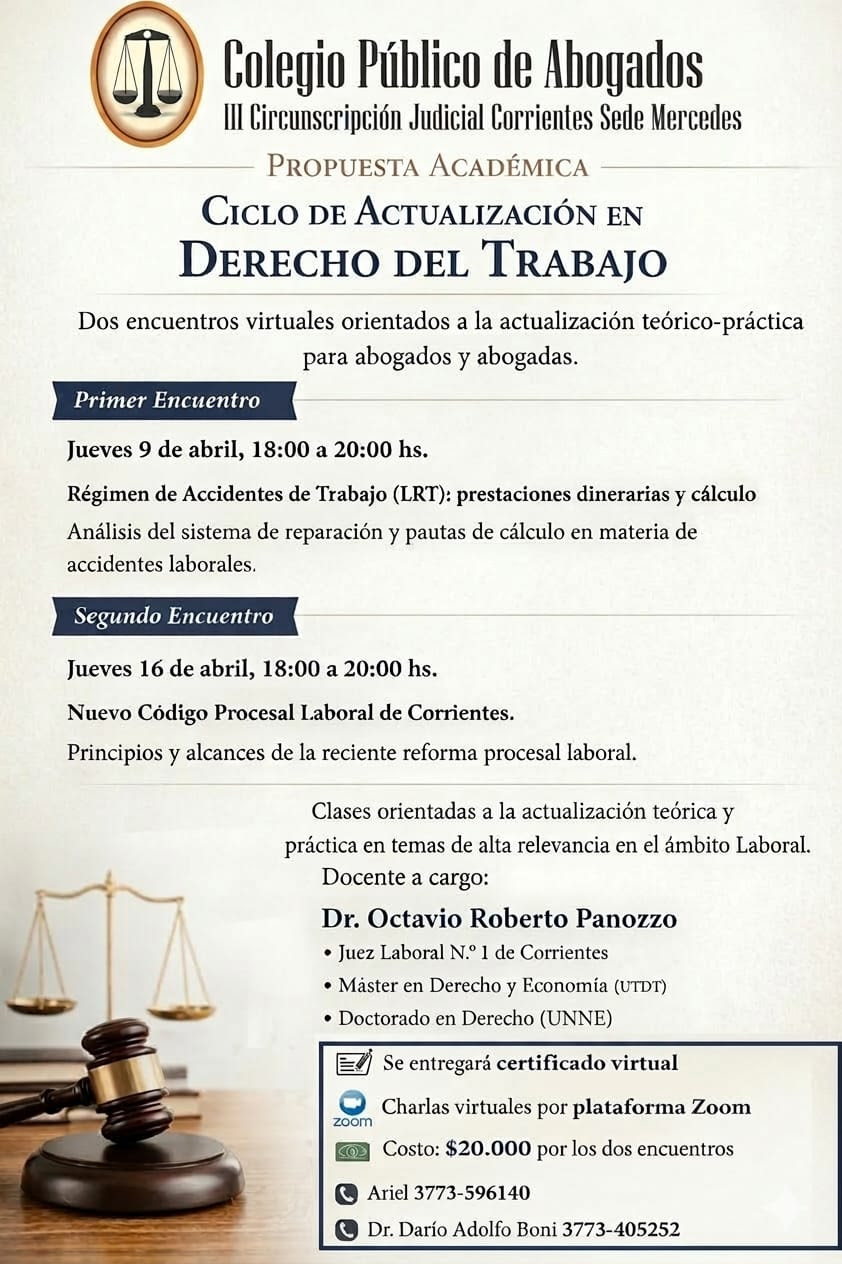 Jueves 9 y 16/04/2026 - 18 hs - VIRTUAL La Institución adhiere e invita a los colegiados a la propuesta académica "Ciclo de Actualización en Derecho del Trabajo" que nos participara el Colegio Público de Abogados de la Tercera Circunscripción Judicial de la Pcia. de Ctes.